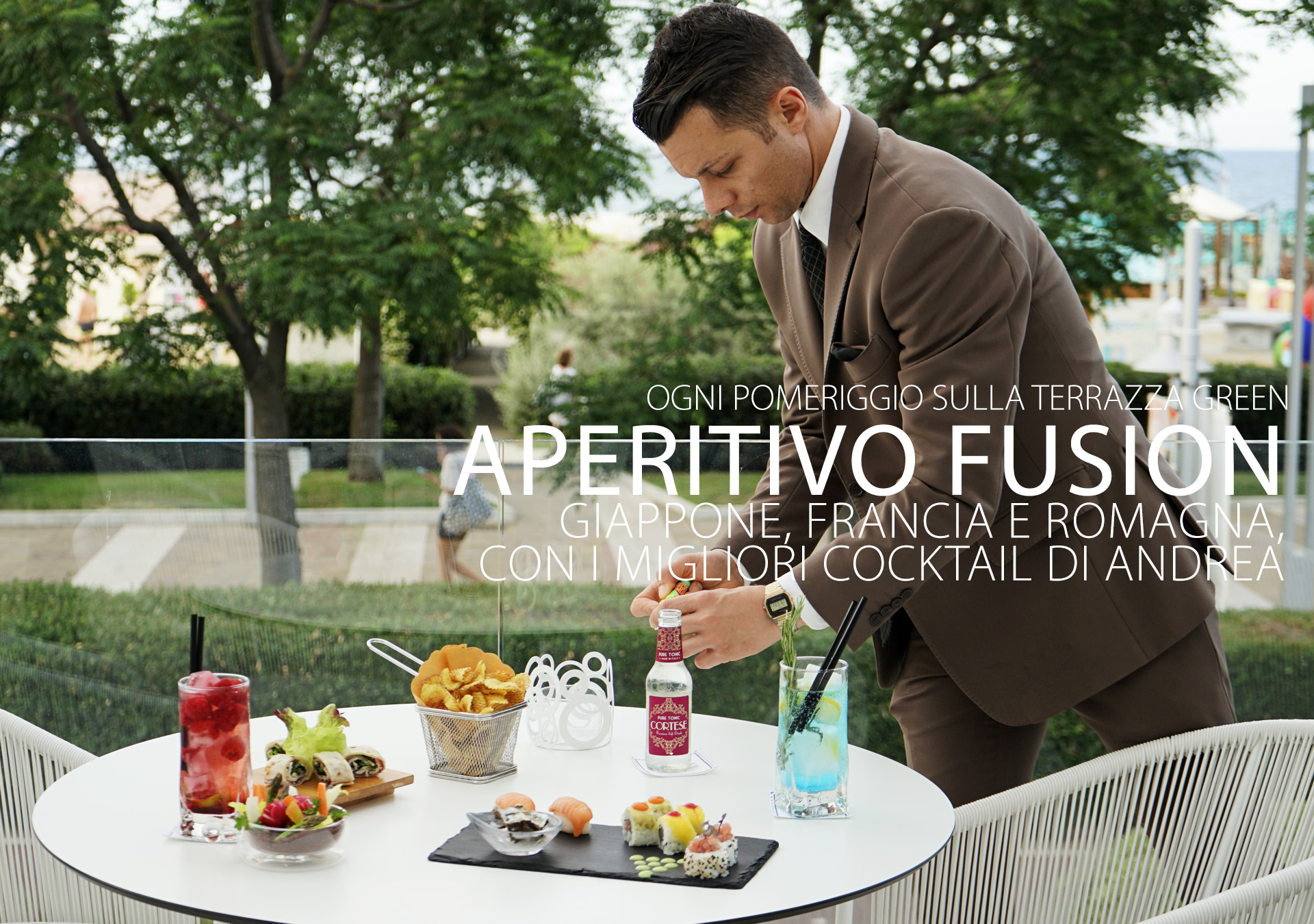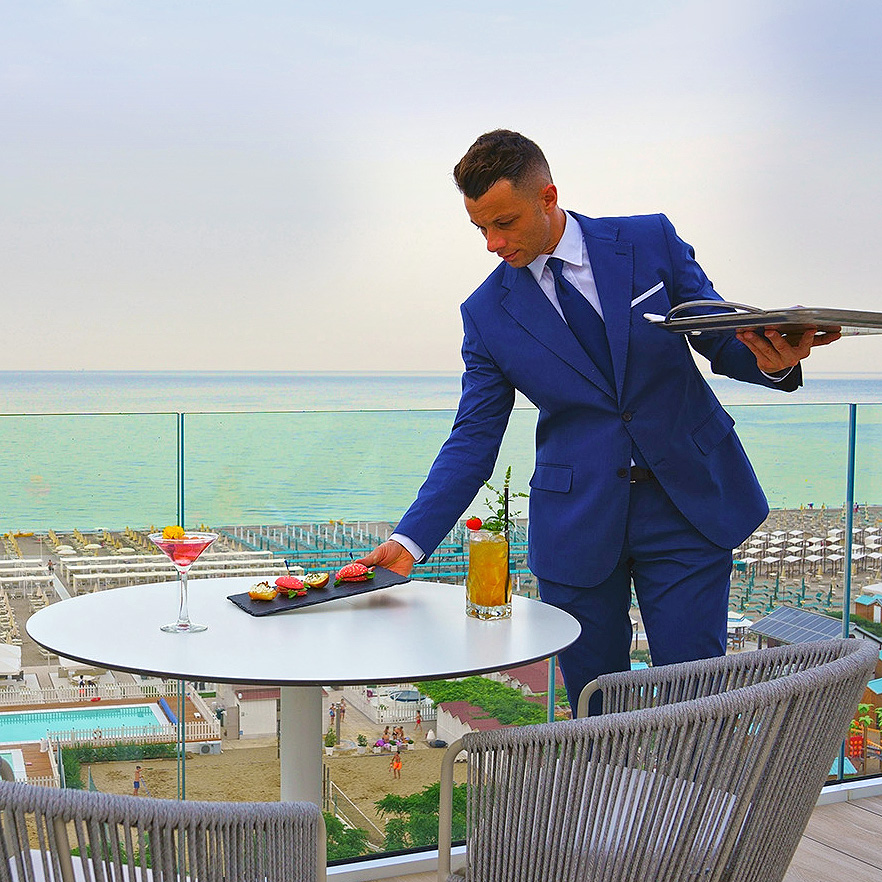 Il nostro barman Andrea sarà felice di preparare per voi uno dei suoi deliziosi cocktail, o di servirvi in terrazza o nel dehor il vostro drink preferito.