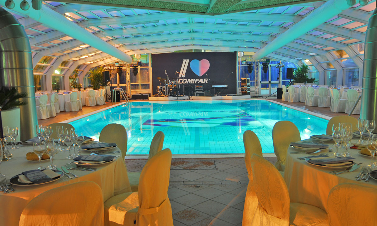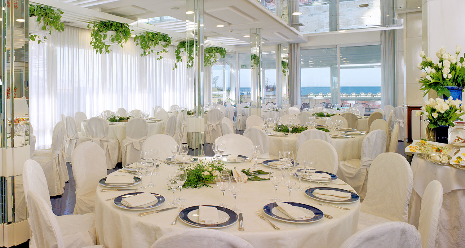 Sirio è la sala esagonale affacciata sulla spiaggia e sulla piscina dell'Atlantic, interamente vetro, per una panoramica senza paragoni sul lungomare di Riccione.