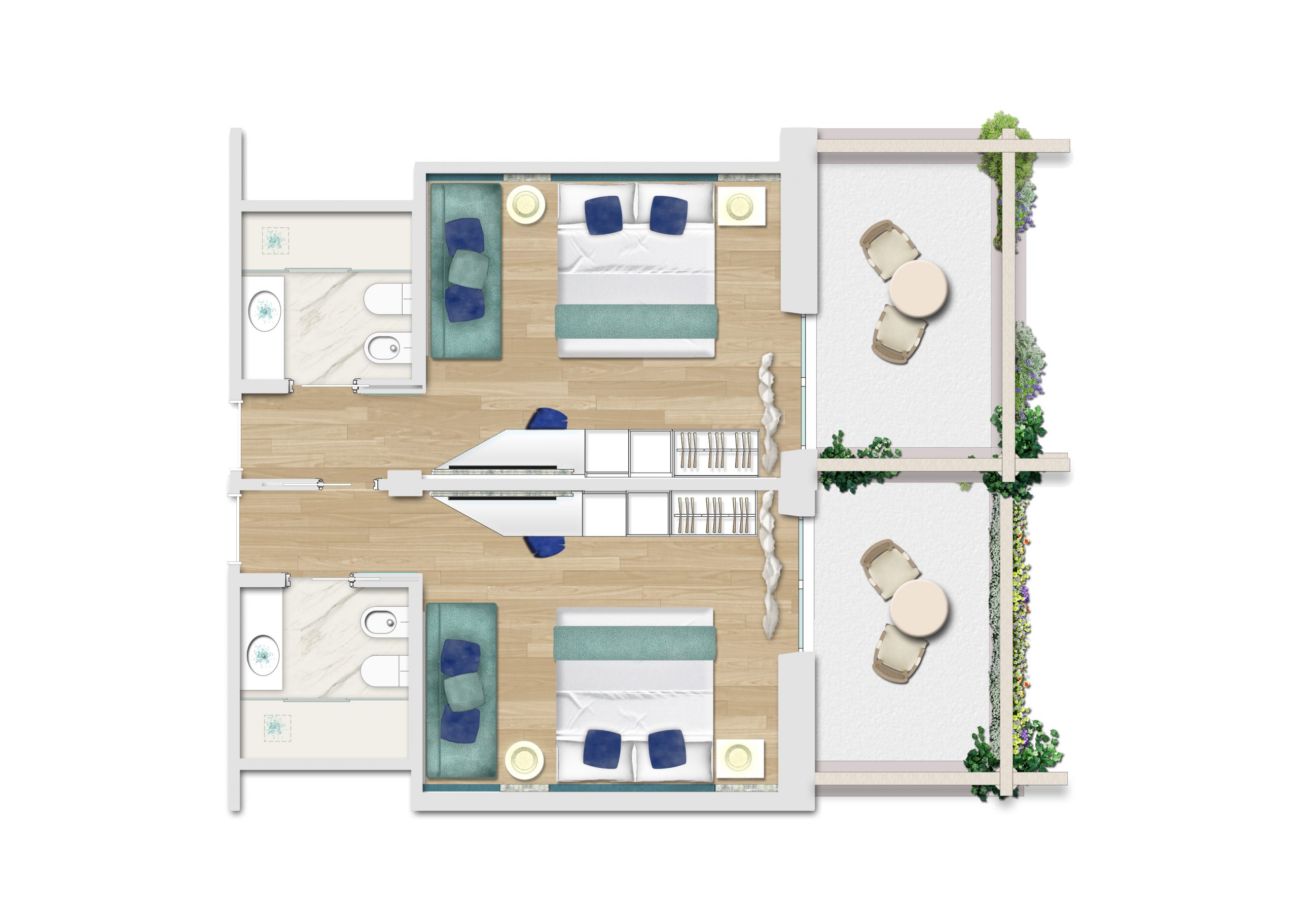 Da 4 a 6 posti letto, le Luxury Comunicanti si trovano al 1°, 2° e 3° piano dell'hotel. Camere nuovissime e ricche di plus moderni: dal letto king size matrimoniale ai singoli plus per i ragazzi. 2 camere da letto con balcone, 2 bagni con moderno box doccia in cristallo, e doppio balcone (o terrazza al 1° piano).