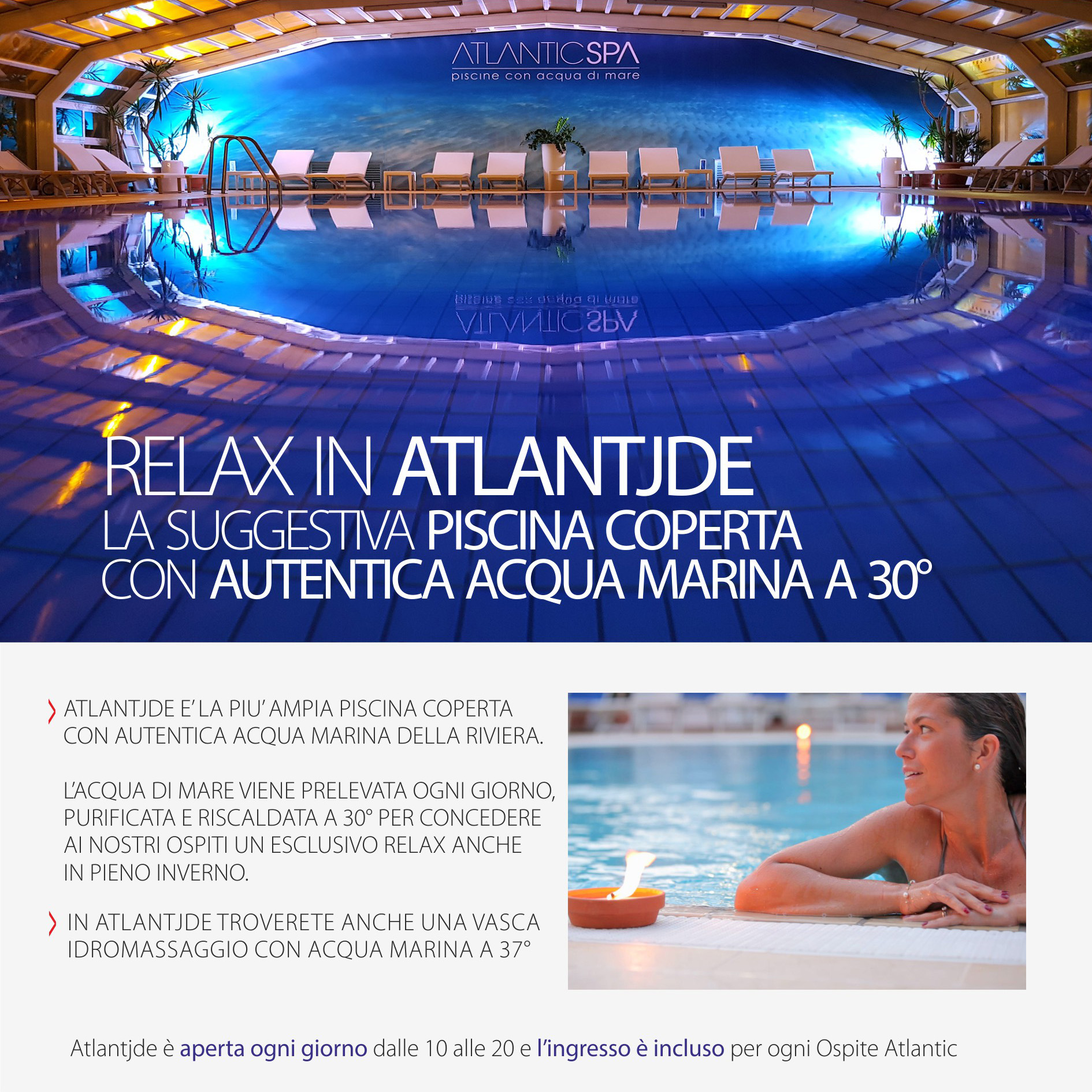 - Il Relax nella piscina coperta Atlantjde, l'unica della Riviera con autentica acqua marina, perfettamente riscaldata e purificata.